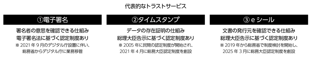 トラストサービスは、電子署名やタイムスタンプをはじめとする複数の仕組みで構成されている。特に企業の実務において重要となるのが、次の三つだ。