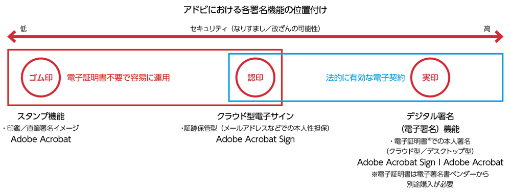 その電子契約において用いられるのが、電子サインや電子署名だ。アドビではこれらの署名機能を、「スタンプ」機能「クラウド型電子サイン」「デジタル署名(電子署名)」機能の三つに区分している。