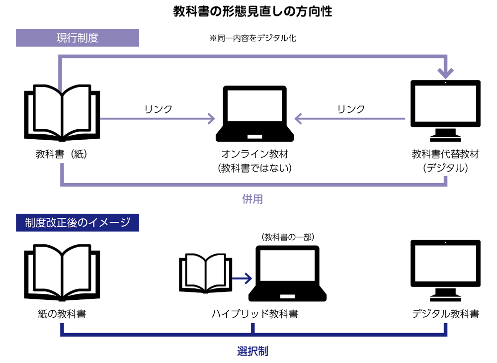 学習指導要領改訂に合わせ、教科書の改訂作業も進められる。そうした中、「教科書の形態としてデジタルも認められるべき」だとする中教審のデジタル教科書推進ワーキンググループの審議まとめが公表された。現在教育現場で使われているデジタル教科書は、教科書検定を合格した紙の教科書と同一の内容をデジタル化した「教科書代替教材」に位置付けられており、あくまで紙の教科書との併用が前提となっている。しかし、次期学習指導要領では「デジタル学習基盤を前提とした新たな学びの在り方」が求められており、それにふさわしい教科書・デジタル教科書の在り方が議論されている。