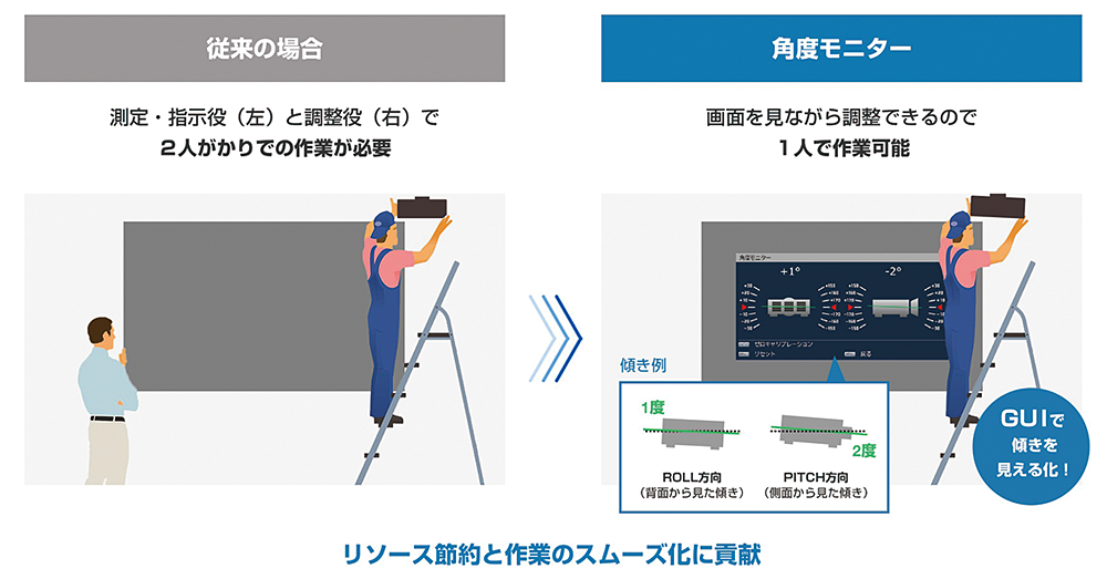 PT-VMQ85J/PT-VMZ82Jは、設置の作業効率を高める調整支援機能も充実している。角度調整を効率化する「角度モニター」は、内部センサーが検知した角度を基に投映画面に前転・側転の傾きをシミュレーション表示する。従来はプロジェクターを設置する際、測定・指示役と調整役で2人必要であったが、角度モニターを活用することで、1人でも取り付け作業を行えるようになるのだ。プロジェクターの取り付けにかかる工数や人的コストを削減できる。「スクリーン調整」機能もGUI画面をより直感的にしたことで、リモコンだけで柔軟な補正が可能になった。外部機器を使わず、円柱や角柱など特殊なスクリーンにも対応し、設置の選択肢を広げている。