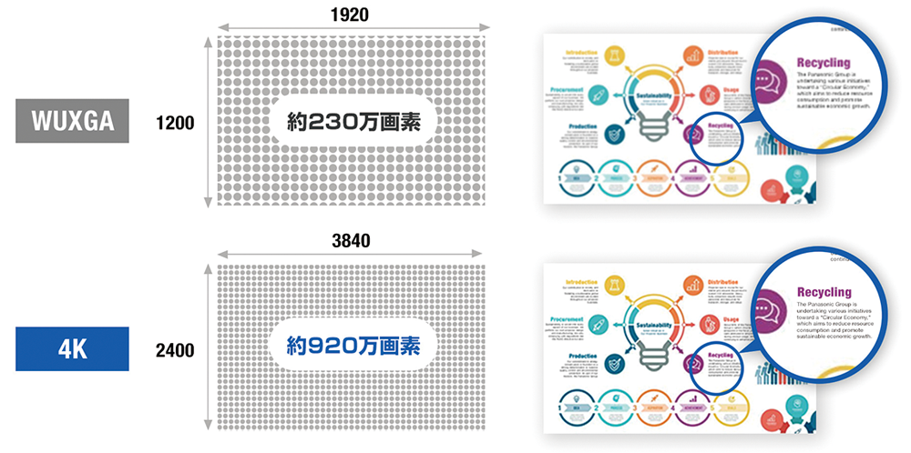 一方、「PT-VMZ82J」の解像度はWUXGAとPT-VMQ85Jに比べてやや低いものの、価格面で優位性があるのが魅力だ。WUXGAの解像度でも、後方席からグラフや文字を十分に視認できるため、会議や授業などの利用シーンに適している。