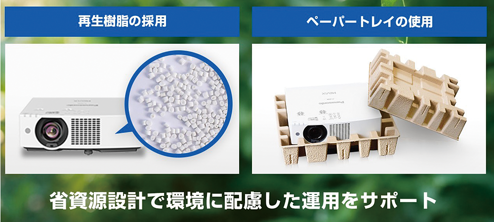 素材面でも環境配慮を徹底している。PT-VMQ85Jは本体プラスチック部品の約50%、PT-VMZ82Jは約59%に再生樹脂を採用。梱包材には発泡スチロールの代わりにリサイクルが容易なペーパートレイを使用し、廃棄時の環境負荷を軽減する。