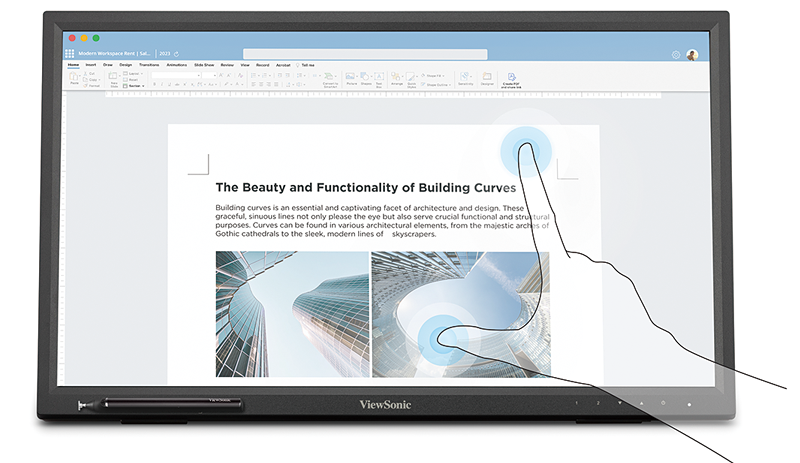 21.5インチモニターの「TD2223-2」は、指、スタイラスペン※、手袋でのタッチ操作に対応する10点マルチタッチスクリーンを搭載している。そのためタップ、ピンチ、スワイプを行うたびに直感的なタッチ体験を提供し、資料の閲覧をはじめとした業務の効率を上げてくれるのだ。