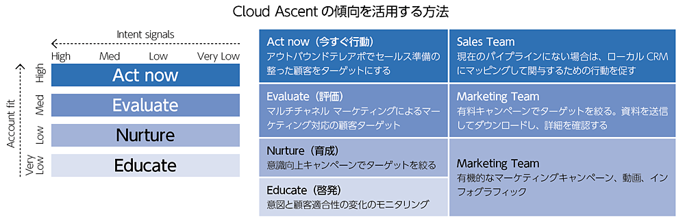 このツールは、お客さまを規模、業種、テクノロジーの導入状況でセグメント化し、実行可能な「購買意欲シグナル」を生成します。AIと機械学習を用いることで、Cloud Ascentはお客さまの購買意欲に関する推奨情報を提供し、お客さまが購入する可能性を段階的に示します。