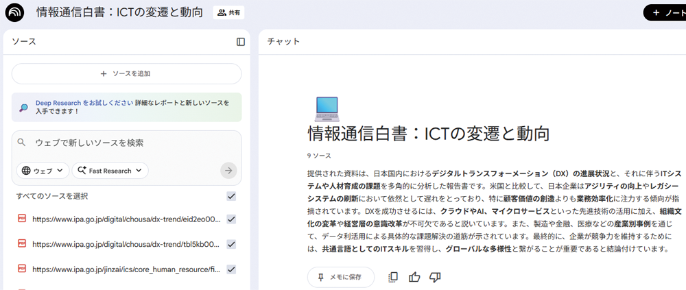 NotebookLM は現時点では、スライドファイル(.pptxなど)を直接生成するわけではありません。しかし、スライドを作るための「確かな根拠のある原稿」を作る段階において、最も信頼できるパートナーとなります。
