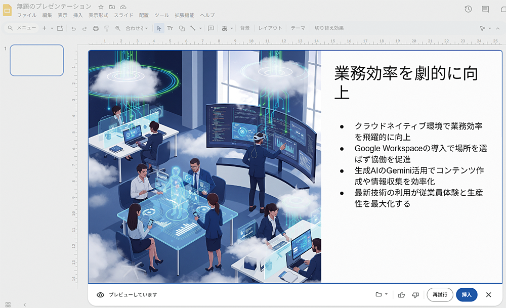 最後に紹介するのは、Google スライド のサイドパネルです。これは、実際のスライド作成・編集画面の中で動作するAIです。画像生成機能を使えば、オリジナル画像をその場で生成して挿入できます。
