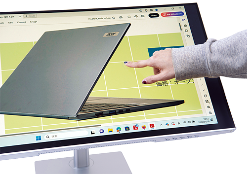 モニターは基本的に、デスクに対して垂直に配置して閲覧する。そうした中で、画面をデスク側に寝かせて閲覧や操作ができれば、姿勢を柔軟に変えられて業務効率の向上に役立ちそうだ。そこでJAPANNEXTの4Kの27インチモニター「JN-IPST27U-FLDC6」を提案したい。