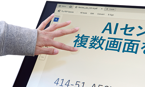 JN-IPST27U-FLDC6では、最大輝度が350cd/m2で、「10点マルチタッチ」機能が搭載されている。0〜115mmでの高さ調整のほか、スイベルは左右各15度、チルトはマイナス5〜70度と本体とアームの幅広い位置調節も可能だ。高さも調整できるので、画面を寝かせた状態でのタッチ操作も実現する。実際に画面を寝かせてみると、コンテンツの視認性を損なうことなく閲覧やタッチ操作が行えた。