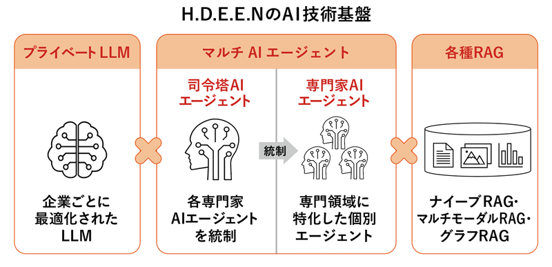 H.D.E.E.NはマルチAIエージェント構造を採用している。ユーザーが質問を行うと、まず「司令塔AIエージェント」が意図を正確に把握し、配下の専門領域に特化した「専門家AIエージェント」に最適なタスクを指示する。専門家AIエージェントは、テキストの意味的近接性に基づいて情報を検索する「ナイーブRAG」、図表やグラフなど異なる形式の情報を統合する「マルチモーダルRAG」、さらにナレッジグラフを活用して関係情報を横断的に探索する「グラフRAG」や推論機能を用いて、専門的な回答を生成する。生成された結果は司令塔AIエージェントによって検証され、最適化された回答としてユーザーに提示される。企業ごとに最適化されたプライベート大規模言語モデル(LLM)を基盤に採用することで、企業や業界固有の知識、専門用語を正確に解釈した回答を生成できるのだ。