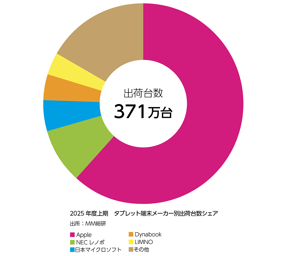 国内におけるタブレット端末の出荷台数は、全国の小中学校に1人1台ずつ学習者用端末を配布するGIGAスクール構想の特需により、2020年度に過去最高を記録した。2025年度は、このGIGAスクール構想第1期から5年経過に伴う買い替え需要が見込まれている。こうした状況を受けて、MM総研は2025年度上期(2025年4〜9月)の国内タブレット端末の出荷台数を調査した。
