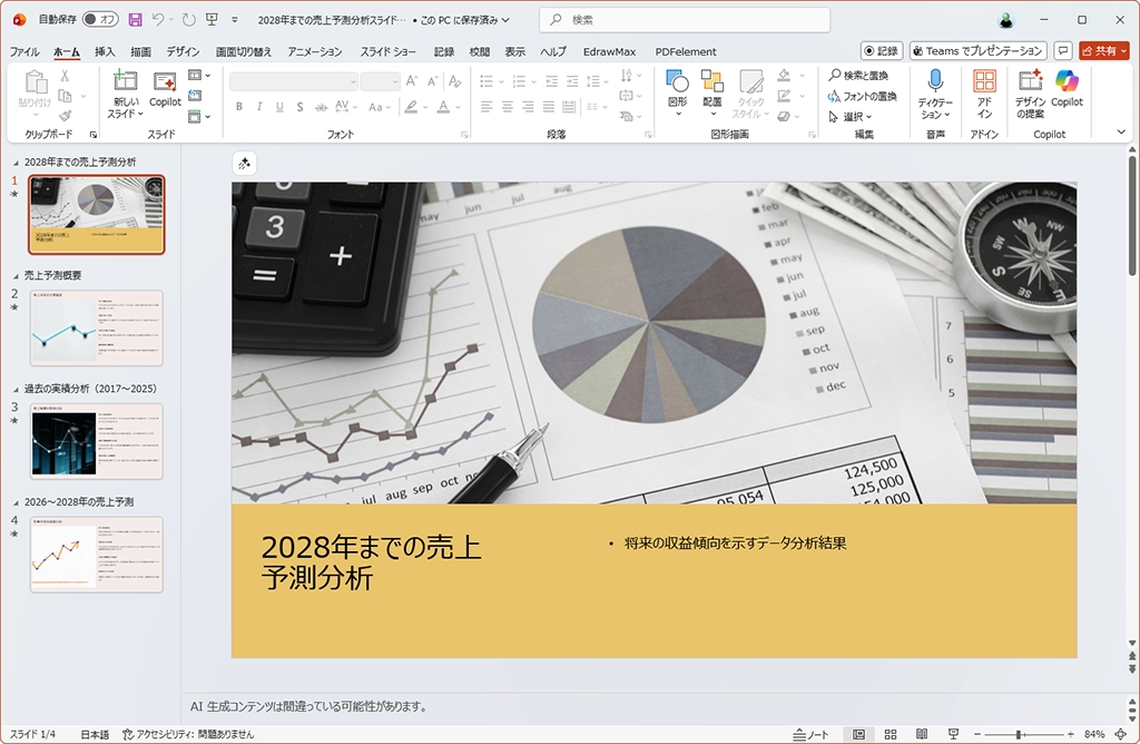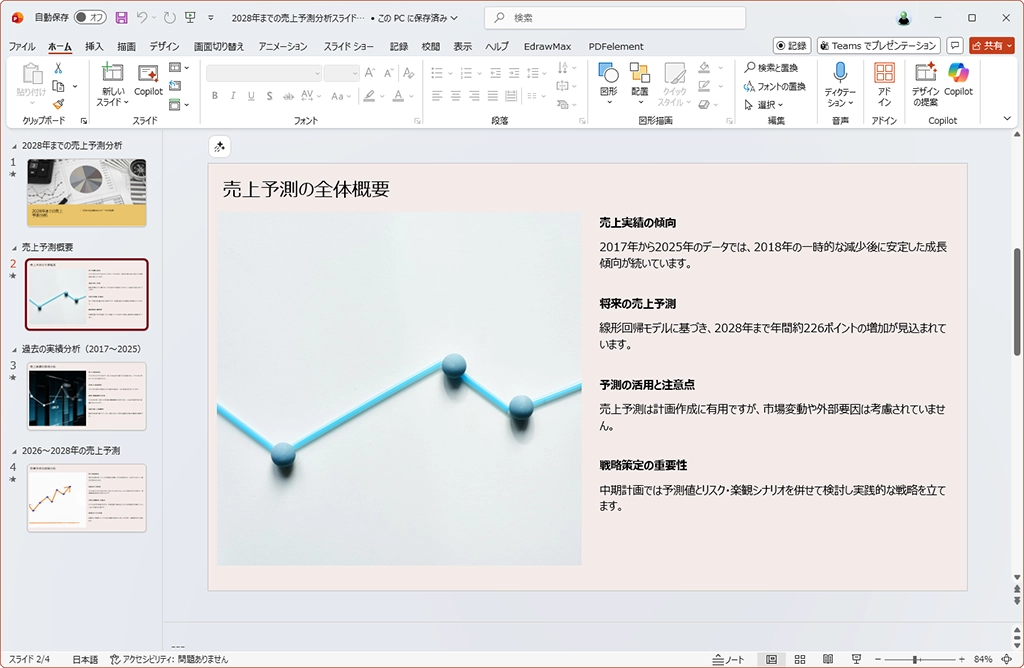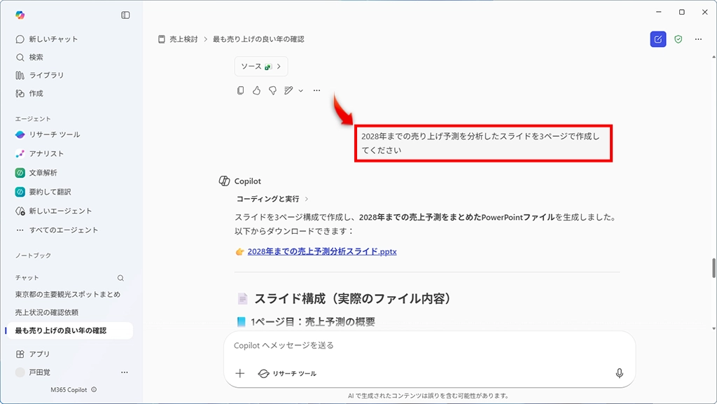 予測のデータが出たが、内容がよさそうなので、この結果をスライドにしてもらおう。今回は、3ページのスライドを作成することにした。この内容をプロンプトに入力するだけで、スライドを作成してくれる。