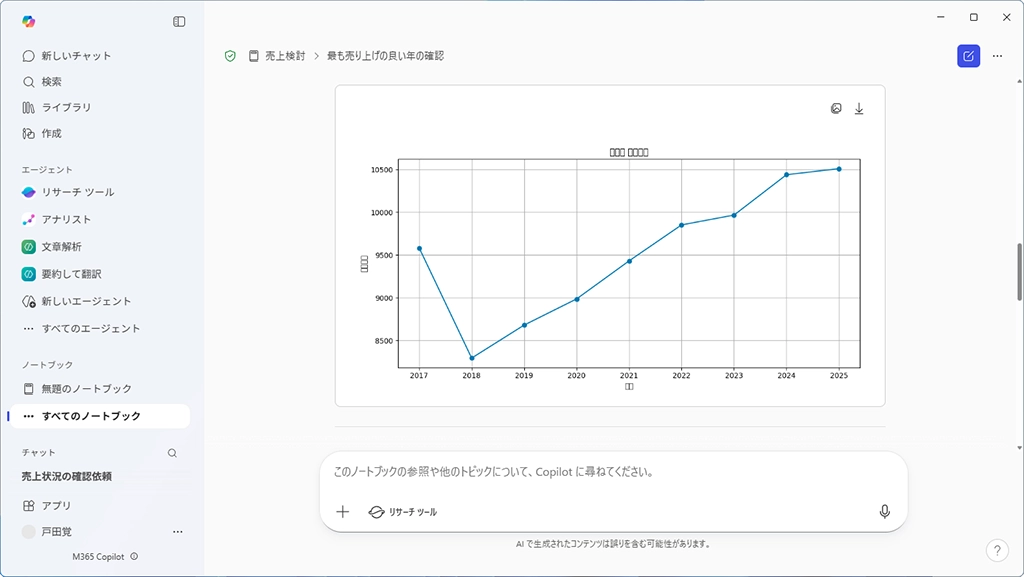 こちらも、「グラフを作って」と入力するだけなのでとても簡単だ。もちろん、集計した数日後や数週間後にグラフを作成してもかまわない。多くのAIで、作業した内容を記録しておけるものの、日々活用していると探し出すのが大変になる。仕事でまとまった作業をするときにMicrosoft 365 Copilotのノートブック機能を使うと決めておくと便利だ。