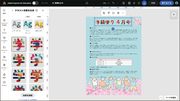 Expressで使えるイラスト素材を挿入して、学級便りをよりグラフィカルにカスタマイズすることも可能だ。見出しに対して「テキスト効果を生成」すれば、より目を引く学級便りにできる。