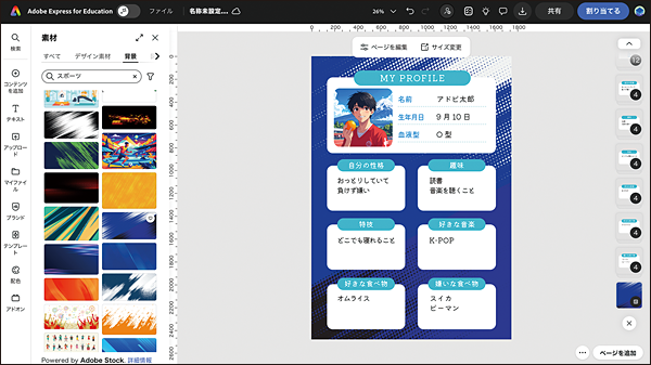 Adobe Fireflyを活用すれば、児童生徒が作成する自己紹介カードのプロフィール画像をコンテンツを追加→メディア→「画像を生成」から画像生成して掲載することが可能だ。
