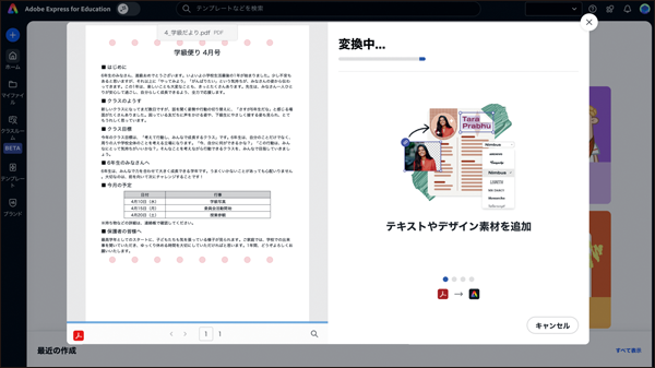学級便りのテンプレートがPDF形式でも、Expressであれば編集可能な形式に変換できる。トップ画面左上「+」マーク→クイックアクション→「PDFを編集」からPDFを読み込むことで元の形式や文章を生かしつつ、より伝わりやすい学級便りを作ることが可能だ。