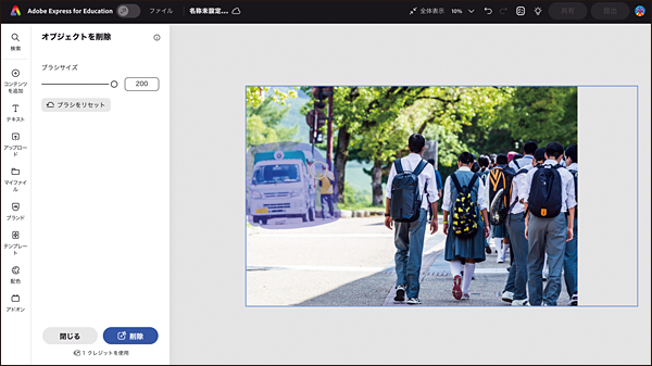 学校行事の写真を掲載する場合、第三者や物の映り込みを削除するなどの加工を行いたい。Expressでは、編集を行いたい画像を選択→左側パネルに表示される「オブジェクトを削除」から削除したい要素を選択して削除できるため、学校のWebサイトや学校便りに掲載しやすい。