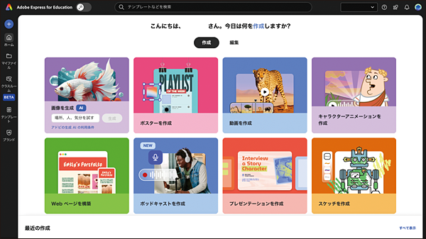 教育機関向けに提供されているAdobe Express for Educationのトップ画面は、一般ユーザー向けのAdobe Expressと比較して作成するコンテンツのアイコンが大きく表示され、分かりやすいUIだ。教員が操作する際も迷わずコンテンツの編集が可能だ。