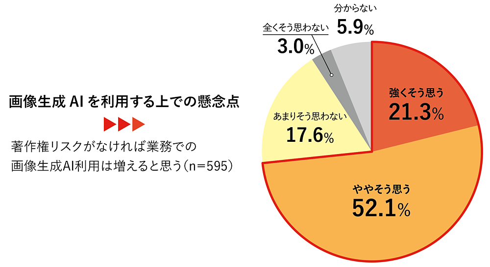 本調査においても、画像生成AIを利用する上での懸念点として「著作権侵害リスク(30.9%)」が挙げられているほか、約7割の回答者が「著作権侵害に対するリスクがなければ、業務で画像生成AIを使用する機会や用途が現在よりも増えると思う」と回答した。