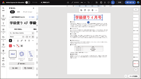 Expressに読み込んだテンプレートを基に、テキストの編集やフォントや色の変更が行える。基の文章をリライトするような生成AIを使った「書き換え」機能を活用すれば、学級便り作りも手間なく簡単に行えるだろう。