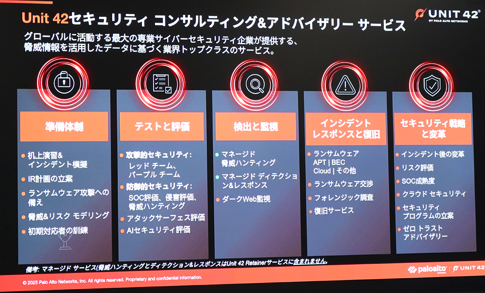 同社では、攻撃のシミュレーションや脅威指導を行う「パープルチーム演習」も実施している。本取り組みを田中氏は以下のように説明する。「パープルチーム演習では、攻撃を疑似的に行うレッドチームと、組織のセキュリティ担当者、IT担当者のブルーチームで、一緒に演習を行います。実際に攻撃を行えるメンバーの攻撃者と同じようなコマンドやツールを使って、お客さま環境を安全に疑似侵害できるレッドチームユニット42のメンバーに対して、ブルーチームのメンバーやお客さまが一緒に攻撃を見ながら対処方法を考えます。どの攻撃がお客様環境下で成功したり失敗したりするかを検討することで、最終的にこの演習が始まる前よりも、セキュリティが強固な状態を構築します。このような形で、有事の際の支援と、インシデントが起きないようにするための事前支援を進めていきます」