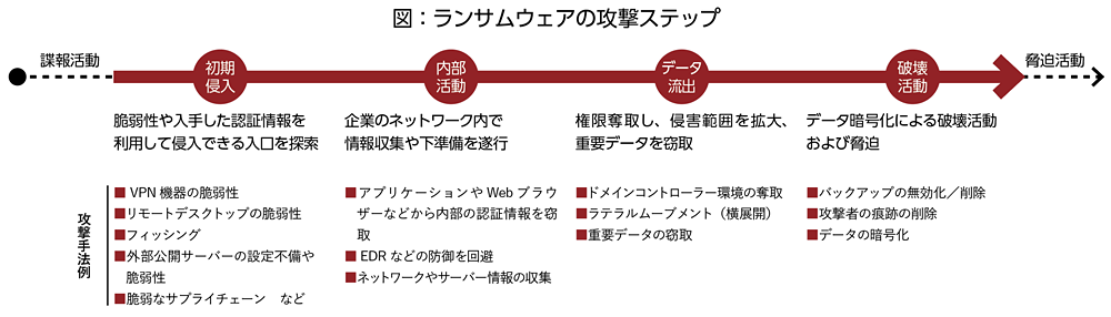 ドメインコントローラーにたどり着けば、その権限を奪取し、各種セキュリティ機能の停止に加え、ランサムウェアの配布や実行、重要データの窃取を行う。その後、破壊活動に移る。復旧を妨げるためのバックアップの無効化やバックアップデータの削除、活動の痕跡(ログ)を削除した上で、最後にデータの暗号化を実行する。そして、窃取した重要データと暗号化したデータを利用して脅迫を行うわけだ(図)。