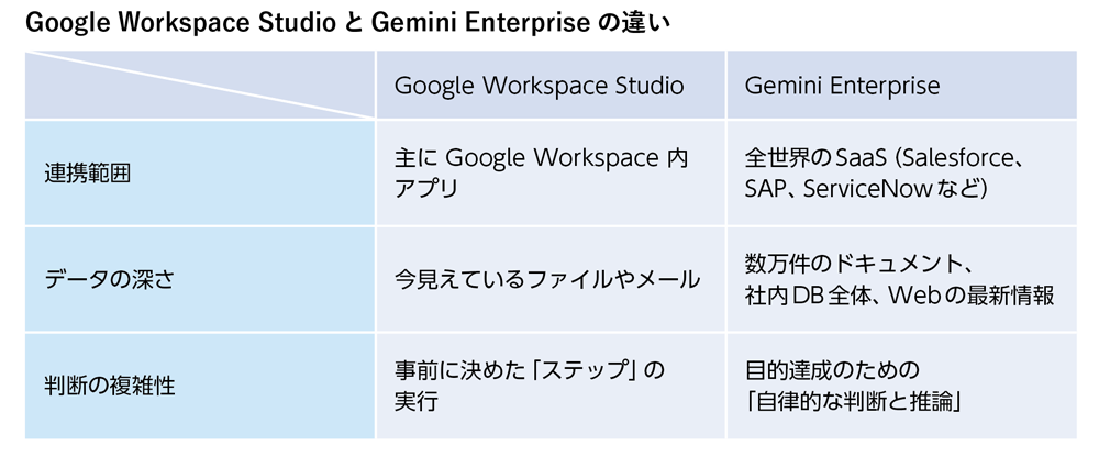 一方で、企業には Google Workspace 以外にも多くのシステム(SaaSや基幹システム)が存在します。こうした複雑な環境を全てカバーするためには、Google Workspace Studio だけでは手が届かない領域もあります。それを補い、組織全体のビジネスプロセスを劇的に変えるのが「 Gemini Enterprise 」です。