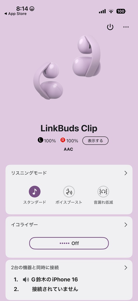 音質についても、総合的には好印象。耳穴に差し込まず、やや離れた位置に音出口部分があるためなのか、より音に広がりが感じられました。また、高音、低音ともにバランスよく再生されており、「スタンダード」、「ボイスブースト」、「音漏れ低減」という3つのリスニングモードが用意され、「Sony Sound Connect」からイコライザー機能も利用できるため、好みに応じた音作りが可能です。