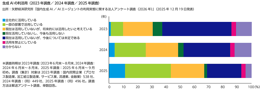 生成AIの活用状況について、2023年の調査では「全社的に活用している」と回答した企業が1.3%、「一部の部署で活用している」が8.6%であり、利用率は1割未満にとどまった。2024年の調査では「全社的に活用している」が4%、「一部の部署で活用している」が21.8%であり、合計で25.8%の企業が生成AIを活用していた。そして、2025年の調査では「全社的に活用している」が11.3%、「一部の部署で活用している」が32.1%と、合計で43.4%もの企業が利用を開始しているという結果となった。