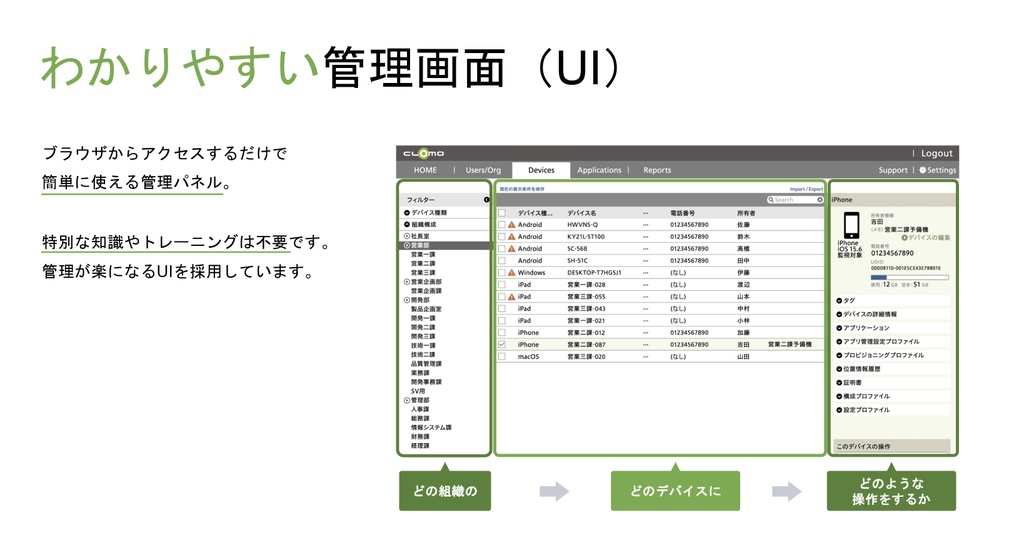 「海外製品の中には設定が複雑すぎて、運用が形骸化してしまいがちになるものがあると思います。その点CLOMOは、直感的に操作できるUIにこだわっています。管理者が操作に迷わないことは、結果としてセキュリティの穴を作らないことにつながります」と村瀬氏は解説する。
