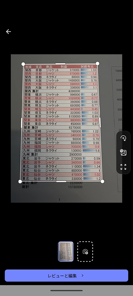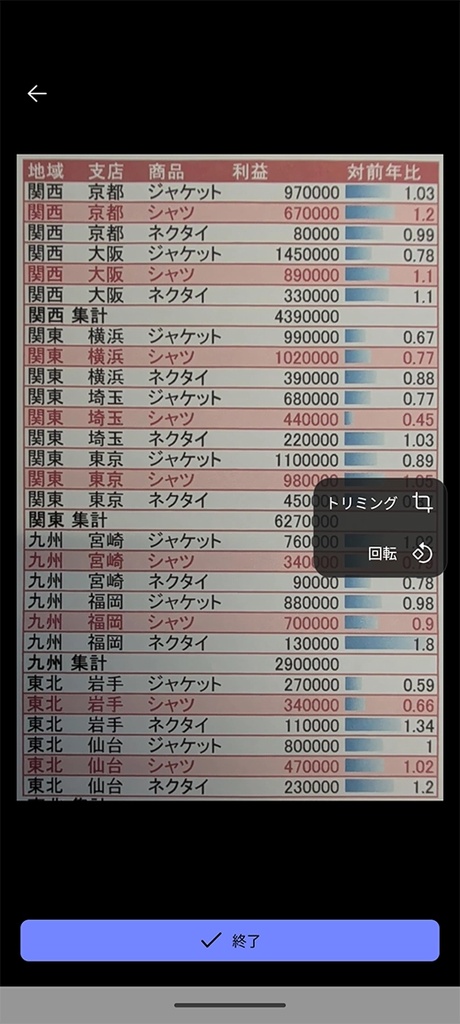 続いて、紙の表を写真撮影する。撮影の条件が良いことは言うまでもないが、光って見えない、文字が小さすぎるなど人が見えないようなデータは、当然ながらデータとしても認識できないので注意してほしい。基本的にはA4サイズ1ページに11ポイント前後で印刷した表は認識できると思う。もちろん、ピントが合っていることが重要だ。