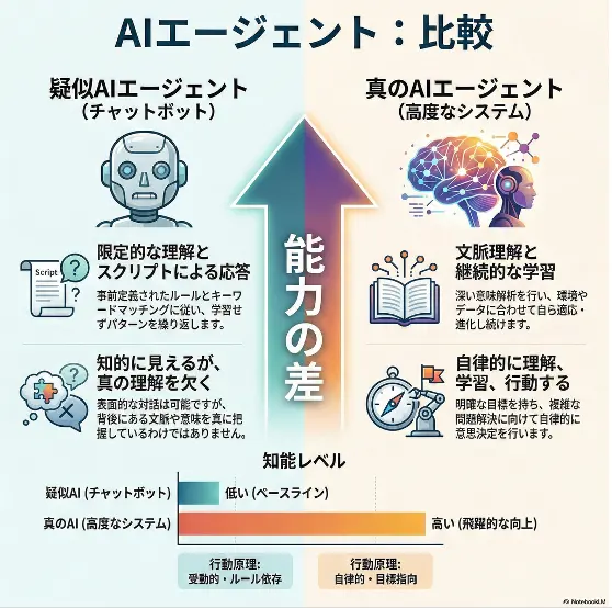 チャットボットでも時にはAIエージェント並の成果を出せる時もあるだろうが、どこまで自律的に判断して作業を行えるかで、大きな違いが出てくるだろう。チャットボットよりは少しはましだが、AIエージェントと呼ぶには判断が不十分なサービスも見られる。