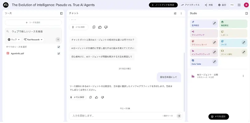 AIエージェントではないが、Google GeminiのNotebook LMを見ると、画面を3分割し、左側に元となるデータをアップロードし、中央のウィンドウで要約などをチャットで指示し、右ウィンドウでは出力の形式を選択することで一連の作業を完結する。ユーザーが何を自分で判断し何をAIに任せるかの整理が一目でわかる。選ぶという人の役割を明確にしてくれているので迷うことが少ない。AIを活用する上で、こうした人の思考を邪魔しない設計も重要になる。