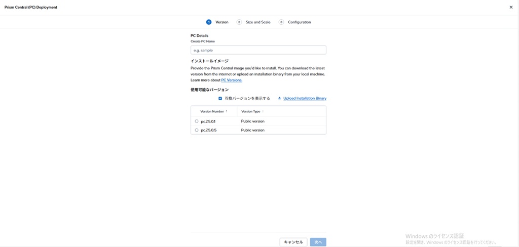 2|現在のクラスタと互換性のあるPrism Centralのバージョンが表示されるため、インストールするバージョンを選択し、「次へ」をクリックします。