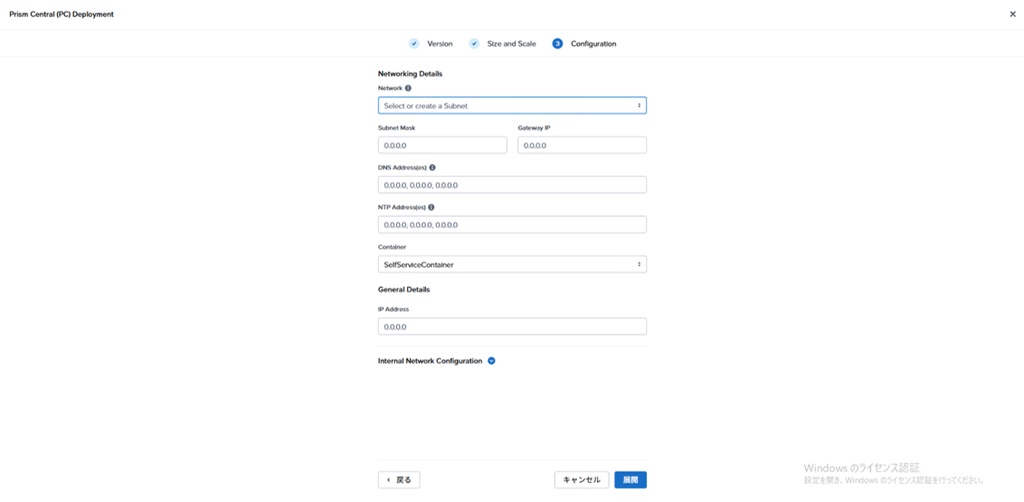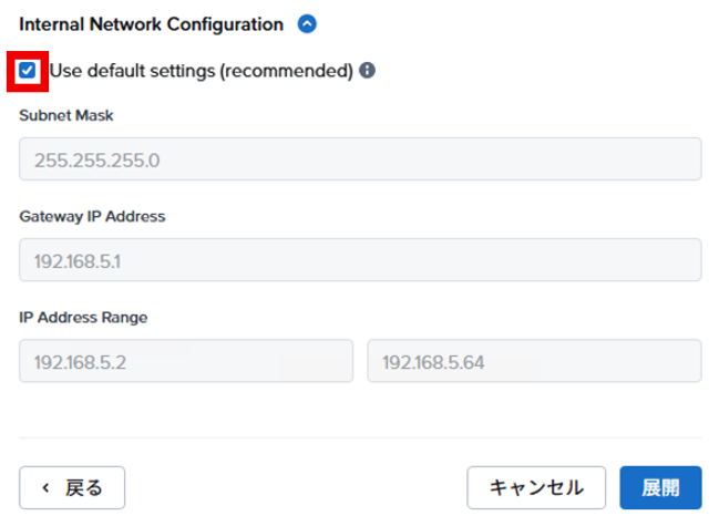 プルダウンを開き、Nutanix内部のネットワーク設定を確認します。Prism Central展開時には、内部通信ネットワークとして 192.168.5.0/24 が使用されます。特別な要件がある場合を除き、本設定はデフォルトのまま使用することを推奨します。