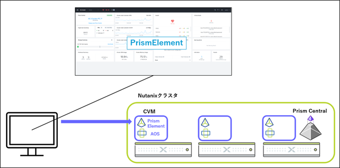 いずれもWeb UIを通じて操作しますが、Prism ElementはCVM上の管理画面に、Prism CentralはPrism Central VMの管理画面にアクセスします。