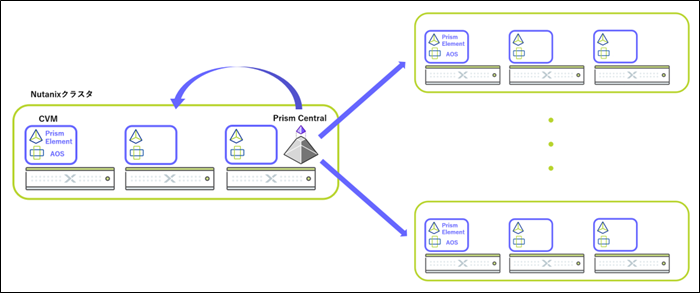 新規クラスタを展開する場合は、あわせてPrism Centralを展開する必要があります。すでにPrism Centralが存在する環境では、新しいクラスタを追加登録し、複数クラスタを一元的に管理することも可能です(図1)。