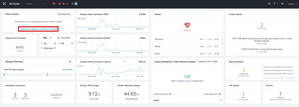 1|Prism Elementダッシュボードから、「Register or deploy new Prism Central」をクリックします。