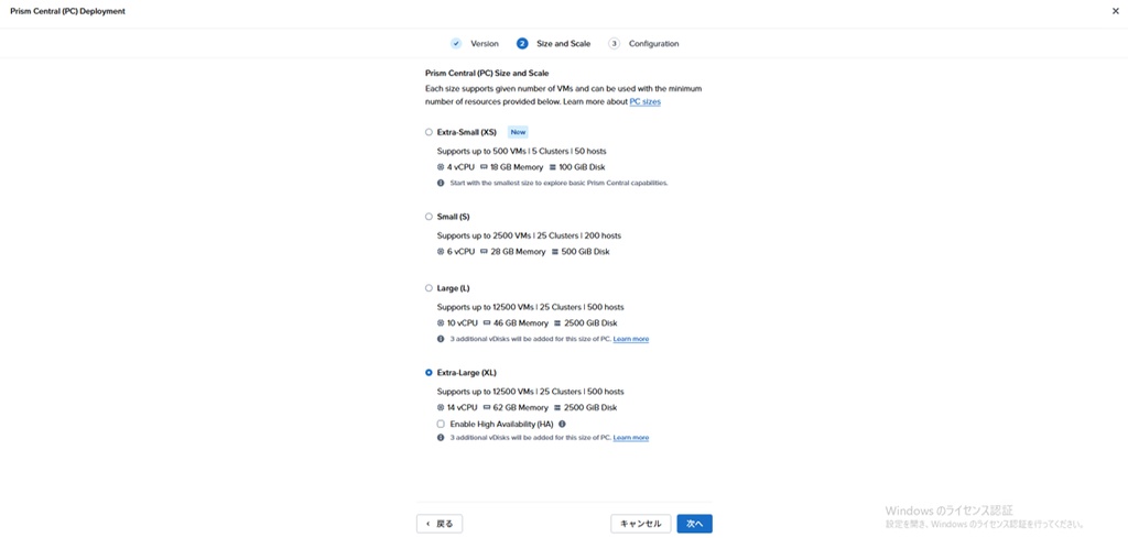 Prism Centralのサイズ(Extra-Small、Small、Large、Extra-Large)を選択します。サイズ選択後、チェックボックスを有効にすると、Prism CentralをHA構成(仮想マシン3台でクラスタ構成)にすることができます。