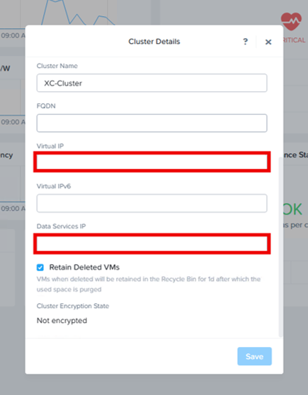 2|Cluster Detailsの下部にあるData Services IP欄、Virtual IP欄に値を入力し、「Save」をクリックします。