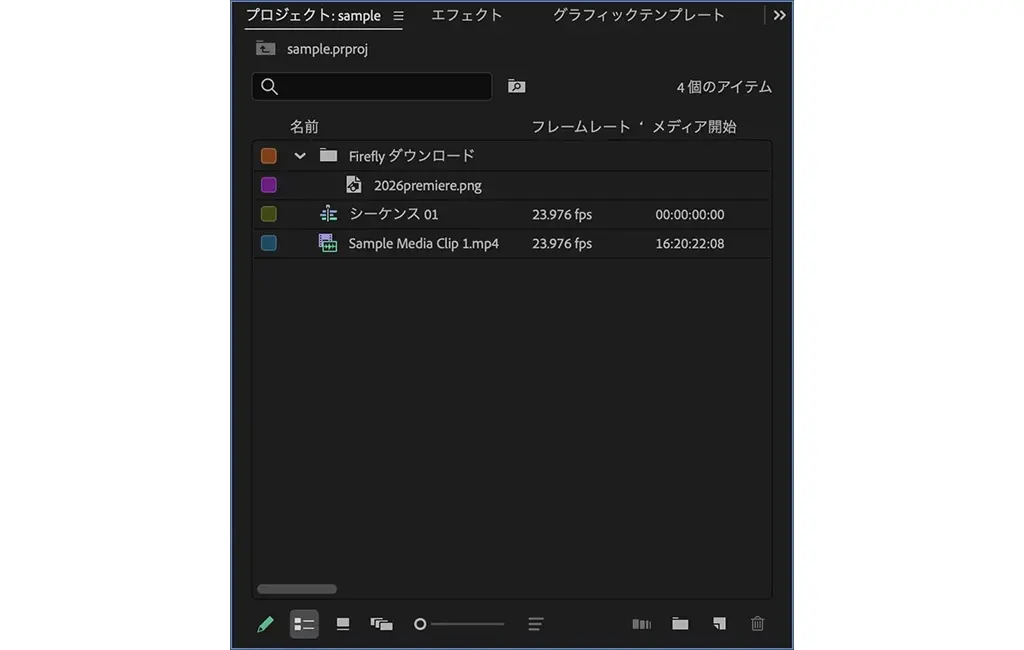 Firefly Boardsに保存した生成素材が、Premiereのメディアブラウザー上に直接表示され、そのまま読み込み可能。