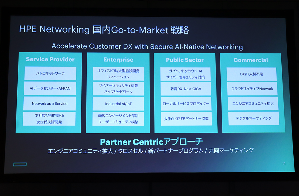 本田氏は続けて、そのほかの営業セグメントについて次のように話す。「二つ目は『Enterprise』です。さまざまな企業の中で、使われている社内の仕組みやプラットフォームが複雑化しています。こうした状況において、当社が提供するSelf-Driving Networkが、お客さまの業務の効率化に大きく貢献できると考えています。Enterpriseは、当社にとっての成長領域です。三つ目は『Public Sector』です。こちらもEnterpriseと同じく、成長領域だと捉えています。多様な国や地方自治体、教育委員会に対してもパートナーさまと一緒になり、課題を解決していくアプローチを取っています。Enterprise向けの体制とは異なる方向から、運営を行っていく営業領域です。四つ目は『Commercial』です。ここはお客さまの数が非常に多いマーケットです。Commercialでは、パートナーさまとの協業をメインにして活動を進めていきます。当社のビジネスは、非常に多くのパートナーの皆さまに支えられています。このパートナーチャネルを旧ジュニパーネットワークスの製品にも使いながら、よりビジネスを伸ばしていくことが、成長材料になると考えています。またこれはどのセグメントにも言えることですが、当社はパートナーさまが中心の『Partner Centric』のアプローチができます。こうしたアプローチが、他部門とも連携を取りながら進めていく、HPEのGo-to-Market戦略です」