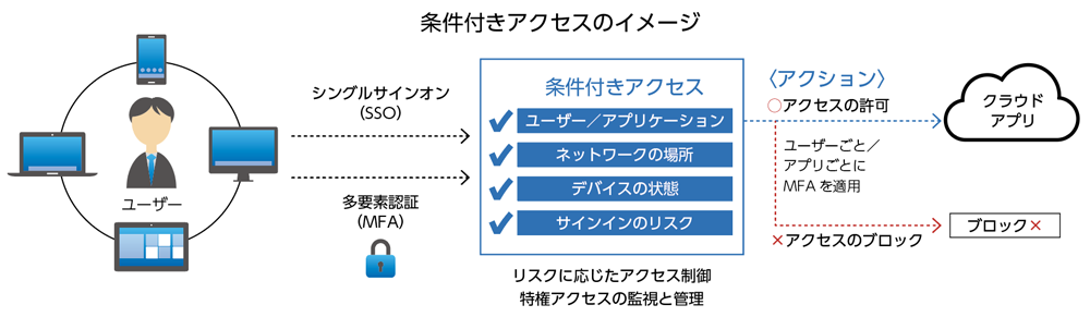 三つ目は、クラウドベースのディレクトリおよびID管理サービス「Microsoft Entra ID」だ。Microsoft 365 Business Premiumで提供されるMicrosoft Entra IDのプラン「Microsoft Entra ID P1」では、条件付きアクセスを利用可能だ。「誰が・何に・どのようにアクセスしてきたとき」について定義が行えるため、「社外からは多要素認証が必須」といった制御が可能になるのだ。加えて、シングルサインオン(SSO)も設定できる。SSOを設定することで、各種サービスへのログインをMicrosoft Entra IDでの認証・認可にまとめられるのだ。ユーザーは、Microsoft Entra IDでアプリケーションを管理および起動するために使用される「マイアプリポータル」を使用して、自分にアクセス許可が割り当てられているアプリへ、1クリックでSSOが行える。利便性を高められるだけでなく、不正なフィッシングサイトへの誘導防止も可能だ。