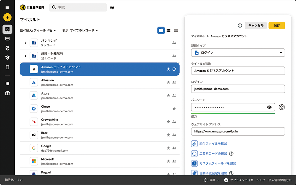 まずパスワード管理を行う「Keeperパスワードマネージャー」は、パスワード強度の担保、ダークウェブ漏えい検知、使い回しの防止、安全な共有、自動入力などに対応している。ユーザーとなる社員に向けて適用できる機能だ。ユーザーごとに「マイボルト」というポータルを用意しており、サービスのアクセス先のURL、ログインID、パスワードを一元管理できる。マイボルトから利用したいものを選択するだけで、サービスに遷移してID/パスワードを自動で入力可能だ。SMSなどを使った二要素認証も組み合わせられる。