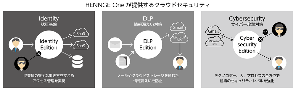 「HENNGE One」は、「Identity Edition」「DLP Edition」「Cybersecurity Edition」の三つの領域で構成される。順を追ってセキュリティの機能を見ていこう。Identity Editionは、さまざまなクラウドサービスに対し、シングルサインオン(SSO)や安全な多要素認証などによる認証基盤(IDaaS)を提供する。VPNを使用せずにオンプレミスシステムへのセキュアなリモートアクセスも実現できる。SSO、アクティブディレクトリ連携、ライフサイクル管理、多要素認証などにより、複数のシステムのIDを効率的に統合し、不正アクセス対策をサポートするEditionだ。SSOでは、SAML認証によって「Slack」や「Zoom」、「クラウドサイン」など443以上のクラウドサービスと連携可能だ。管理者向けWebマニュアルが完備されているため、スムーズなSSO設定を行える。万が一パスワードが盗まれても、プッシュ通知による本人確認や入場証といったデバイス認証など多要素認証を加えることで不正アクセス対策を可能としている。