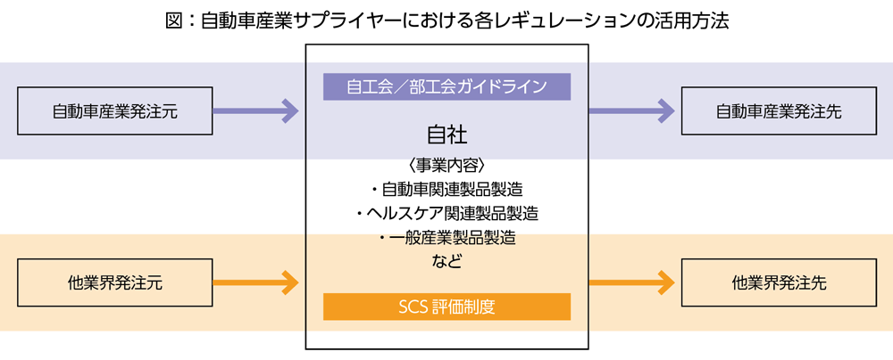 そのため、自動車産業のサプライヤーは、自工会/部工会ガイドラインへの準拠を通じて、完成車メーカー(OEM)からの要求を満たすだけでなく、SCS評価制度を通じて他業界との取引にも通用する客観的な説明力を確保できる。