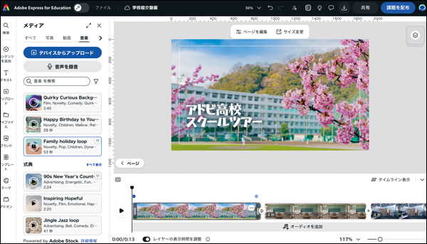 学校紹介動画に添える音楽素材も豊富にそろっている。児童生徒は動画のイメージにマッチした音楽を選ぶだけで当該位置にBGMや効果音を追加できる。コンテンツを追加→メディア→音楽から追加が可能だ。