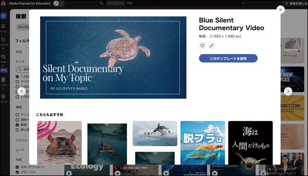 教育向けExpressでは、Expressのプレミアムプランと同等の機能や豊富なテンプレートが利用できる。学校紹介に向いたテンプレートを探し使用するだけで基本のデザインが反映される。