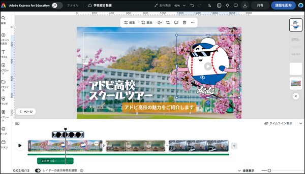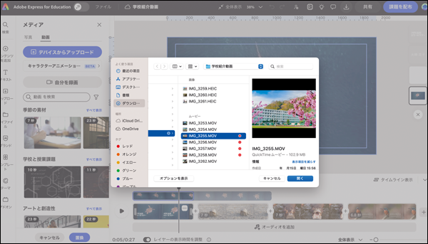 撮影済みの学校紹介動画をアップロードし、テンプレートファイルの動画を置換する。学校の外観や校内の様子など複数の動画もシームレスに接続し、一つの学校紹介動画として編集できる。