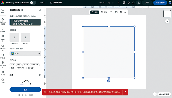 教育向けExpressに搭載されているFireflyは、ガードレールを強めに設定している。不適切な画像や、著作権を侵害するような画像を生成しようとした場合は、画像のように画像生成がブロックされる仕組みだ。