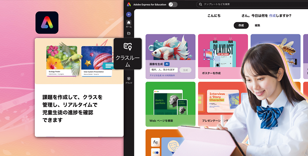 2026年3月16日、アドビは日本の新学期に合わせて「Adobe Express for Education」(以下、Express)のクラスルーム機能の日本語対応を正式にスタートした。クラスルーム機能で提供する主な機能は以下の通り。一つ目は「クラスの作成と児童生徒の追加・招待」だ。教員がExpress内でクラスを作成し、児童生徒を簡単に追加・招待できる。二つ目は「課題の一元管理」だ。教員はExpress上で課題を作成し、児童生徒へ配布できる。課題を受け取った児童生徒は、Expressを使って課題にあった制作物を作成し、提出する。課題の配布から制作、提出、共有まで、全てのフローをExpress内で一元管理可能だ。三つ目は「クラスギャラリー」だ。提出された課題を、ギャラリー形式でまとめて表示する。教員の提出物管理の利便性向上はもちろん、クラスの児童生徒と共有したり、保護者に共有するリンクを発行したりできる。児童生徒の名前(イニシャル)表示はオンオフ設定が可能だ。またクラスギャラリーは、共有リンクを知っている人しか閲覧できないため、安心して利用できる。